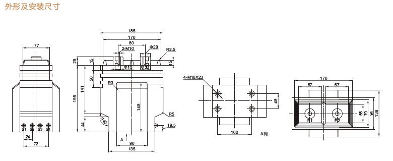 本型號互感器采用環氧樹脂全封閉澆注成型。體積小,重量輕,適宜于任何位置,任何方向安裝,底部有四個M10螺孔供安裝使用。本型號互感器的鐵芯用優質冷軋硅鋼片繞成環形,并經嚴格的熱處理。二次線圈由測量級和保護級兩個繞組組成。